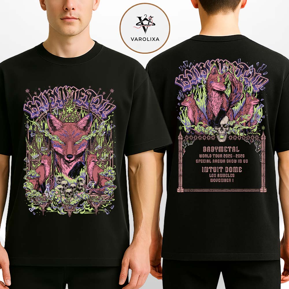 Featuring a striking Fox Chapel design printed on both the front and back, the artwork combines sharp metal-inspired detailing with Babymetal’s signature visual themes. High-contrast graphics, symbolic fox imagery, and dynamic composition give the shirt an eye-catching, collectible look. Whether worn at concerts, festivals, or casual streetwear moments, the design stands out with powerful character and fan identity.