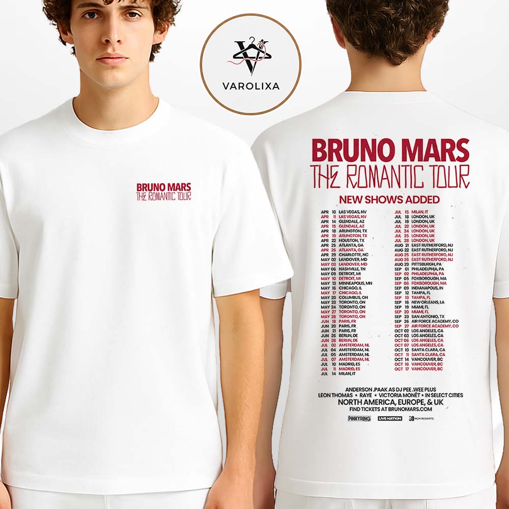 Bruno Mars Tour Dates 2026 Poster At Various Venues In Multiple Cities Various States On Tour Dates The Romantic Tour World Tour Artwork Two Sides Unisex T-Shirt