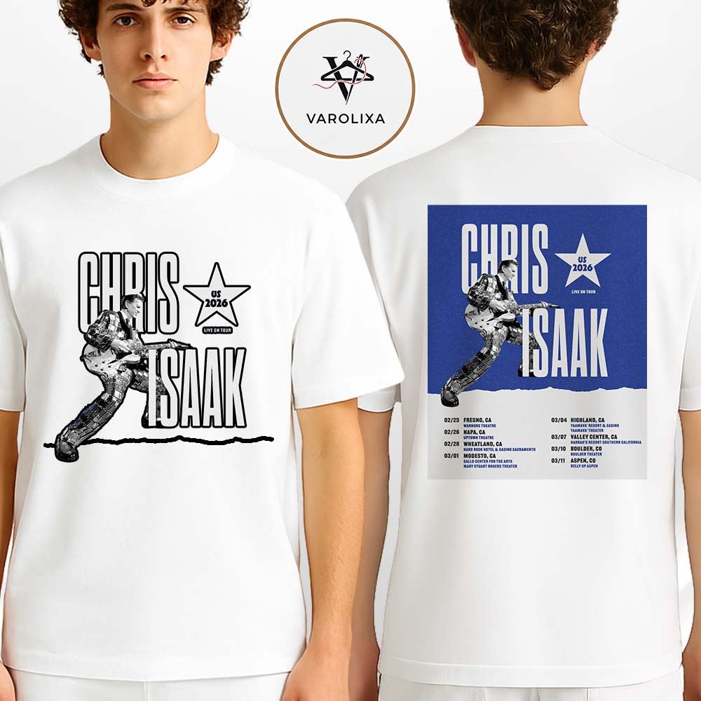 👉 Shop the Chris Isaak Live On Tour 2026 Poster At Multiple Venues Across California And Colorado Two Sides Unisex T-Shirt at Varolixa today.