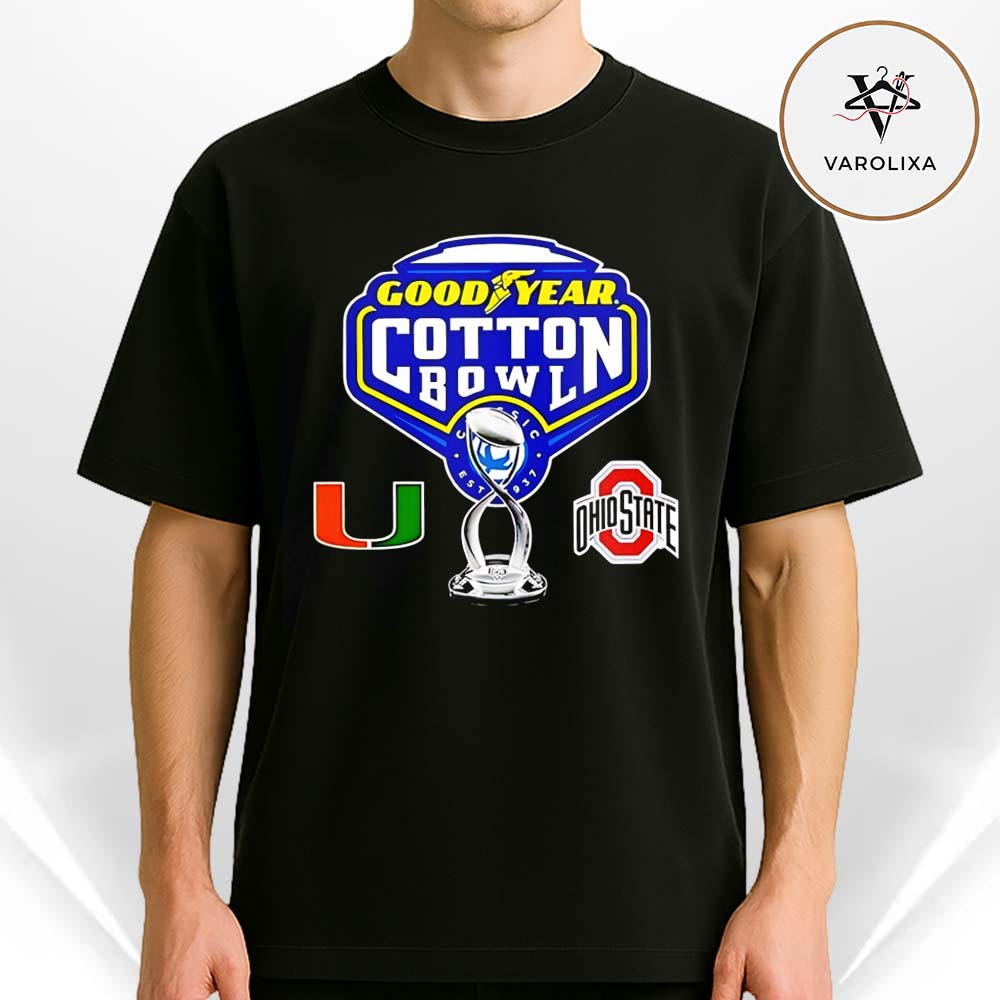 👉 Shop the Coca-Cola Bowl Season Miami Hurricanes vs Ohio State Buckeyes Matchup 2025 Goodyear Cotton Bowl Unisex T-Shirt at Varolixa today.