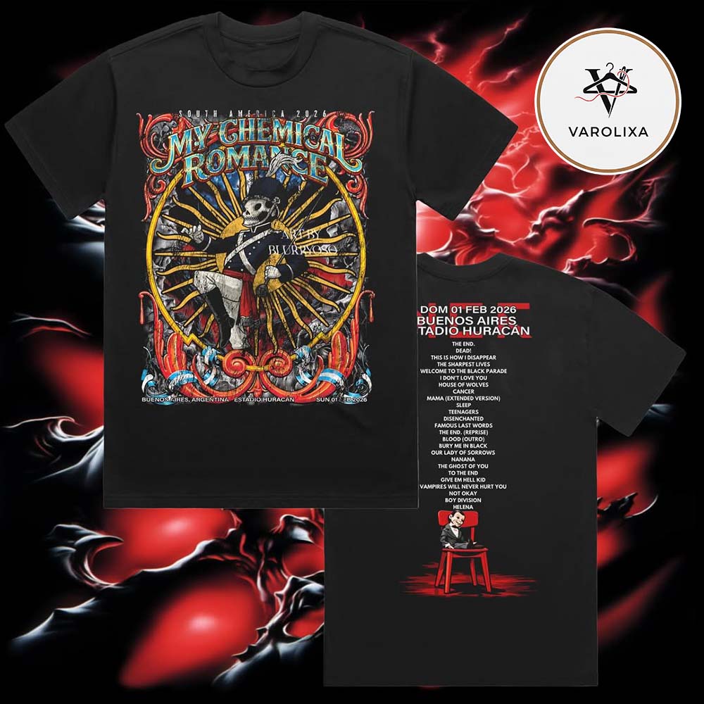 👉 Shop the My Chemical Romance Baroque Skeleton Ring Artwork South America Tour 2026 At Buenos Aires Estadio Huracán On Feb 1 Two Sides Unisex T-Shirt at Varolixa today.