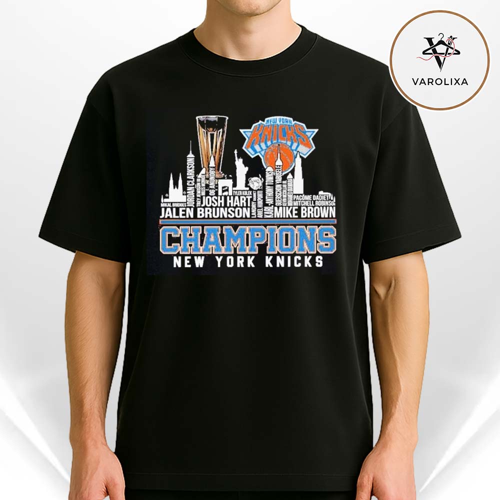 👉 Shop the New York Knicks 2025 NBA Cup Champions Players Names Skyline Unisex T-Shirt at Varolixa today.