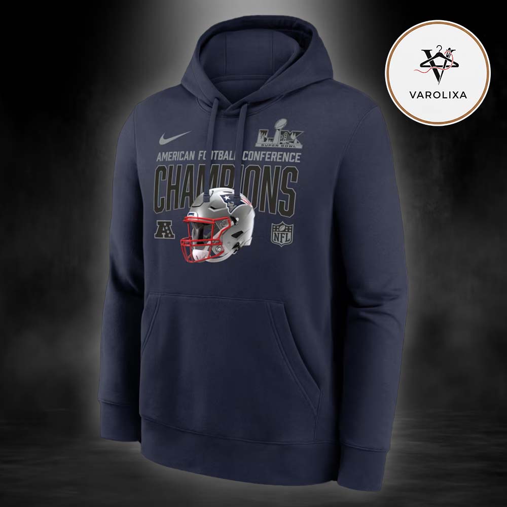 👉 Shop the Nike Navy New England Patriots 2025 AFC Champions Glory Shield Unisex Hoodie at Varolixa today.