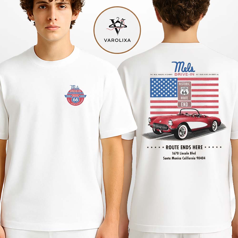 Route 66 Ends Here Mel’s Drive-In Santa Monica 100th Anniversary Road Trip Memory Two Sides Unisex T-Shirt