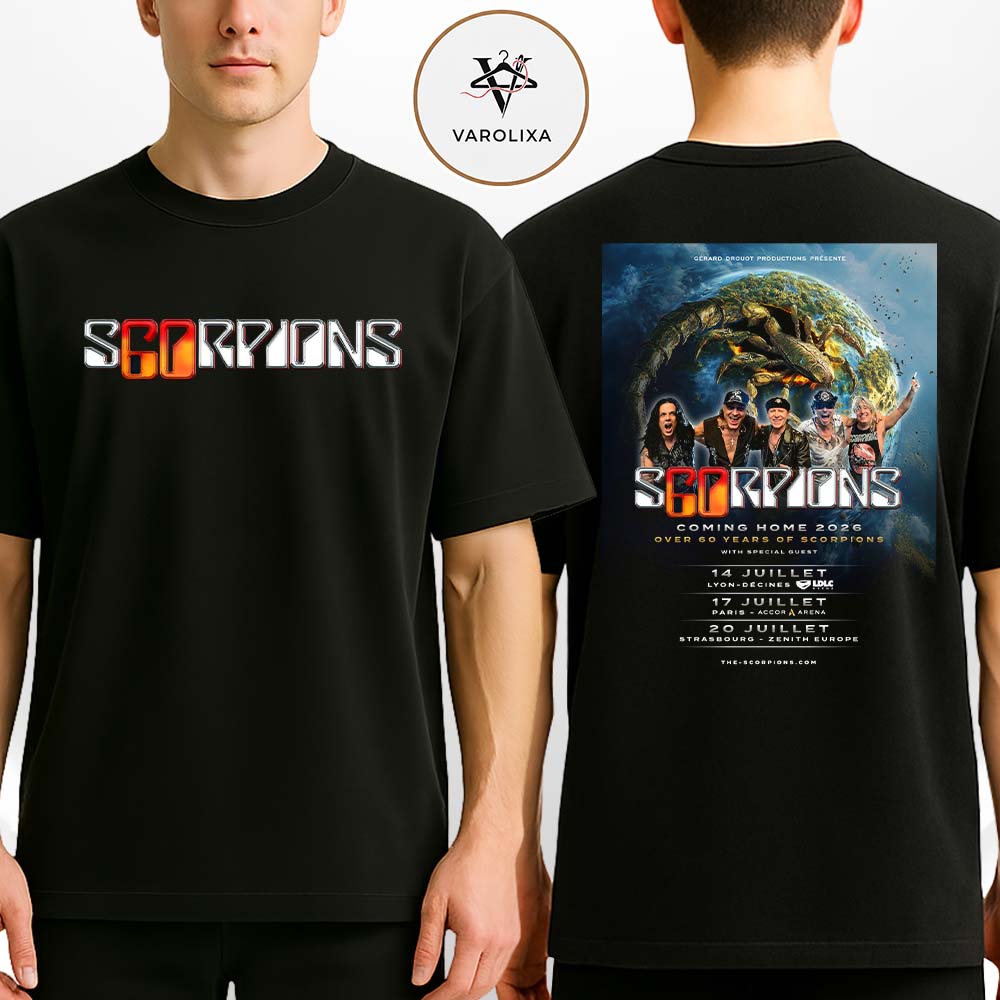 👉 Shop the Scorpions Coming Home 2026 Over 60 Years Of Scorpions France Tour Dates Lyon Paris Strasbourg Two Sides Unisex T-Shirt at Varolixa today.