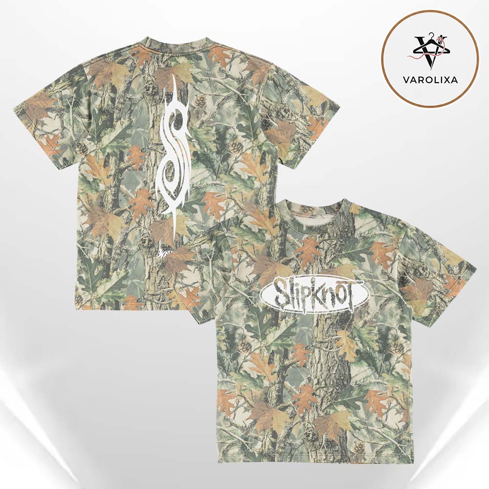 👉 Shop the Slipknot x Welcome Oval Logo Camo All Over Print Tee Metal Band Graphic Forest Pattern Streetwear at Varolixa today.